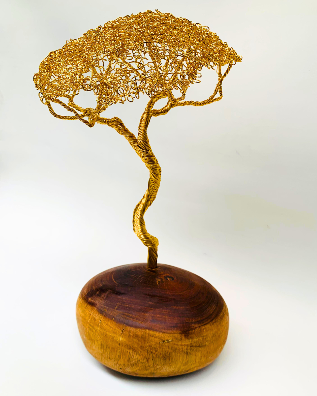 Elegante e imponente, a escultura Árvore da Vida é uma peça que transcende o decorativo para se tornar símbolo de conexão, força e eternidade. Cuidadosamente confeccionada à mão, cada galho é formado por fios de cobre artisticamente retorcidos e finalizados com pintura dourada, resultando em uma obra de arte única, rica em textura e brilho sutil.