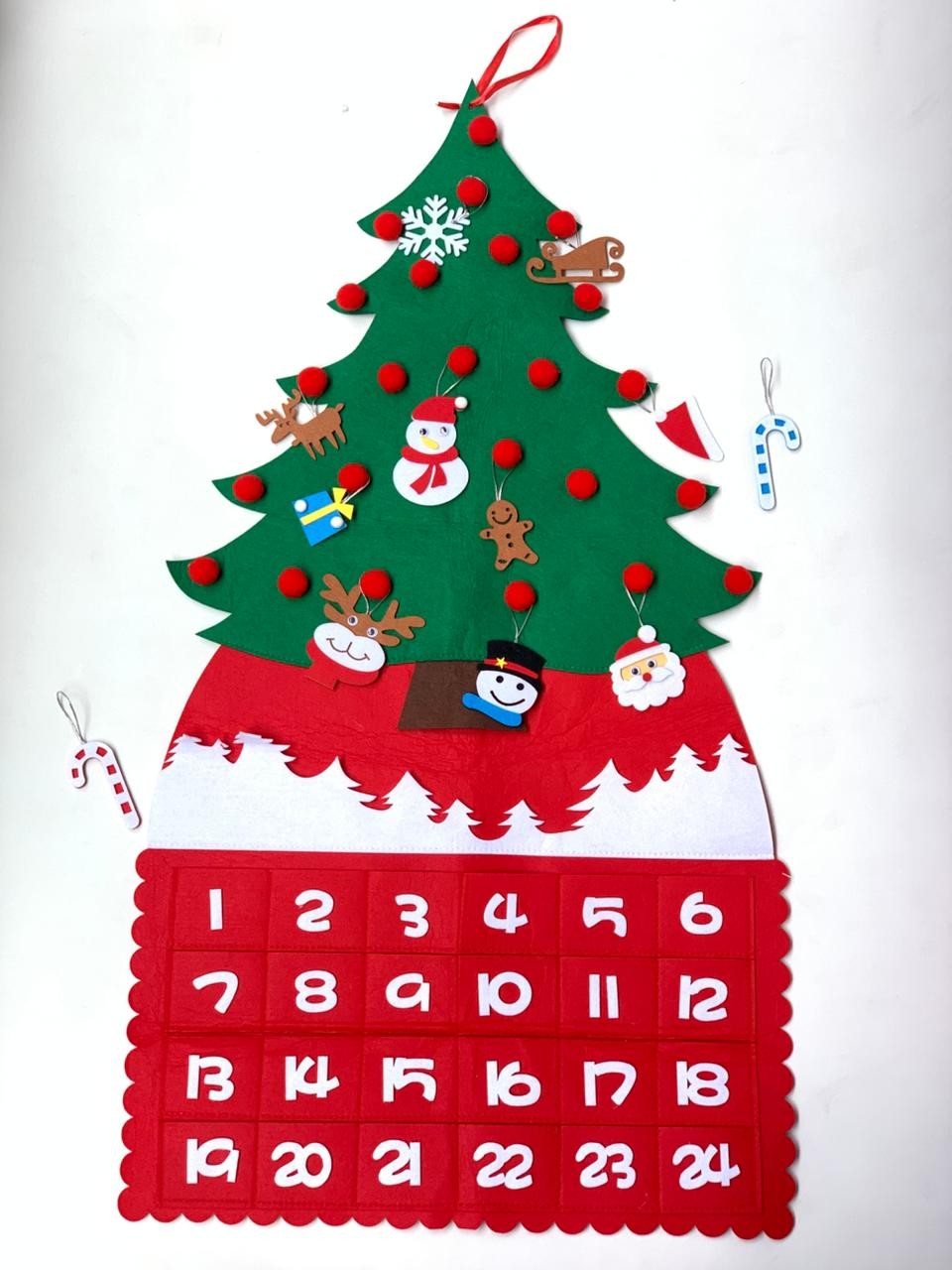 Um item encantador que une tradição e diversão. Produzido em feltro, tem formato de árvore de Natal decorada com bolsos numerados de 1 a 24, permitindo colocar pequenos presentes, doces ou mensagens para cada dia de dezembro até o Natal.