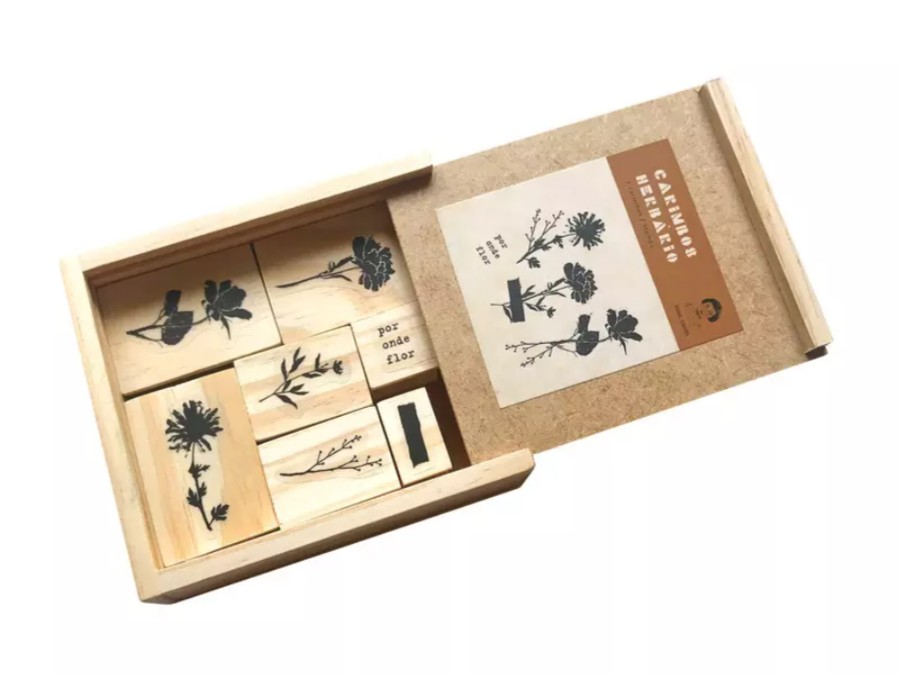 Acompanha uma caixa de madeira resistente e compacta, que mantém os carimbos organizados e prontos para uso, além de ser um estojo charmoso para presentear amantes de papelaria e artesanato.