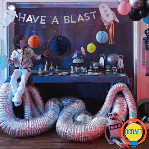 Composta por duas guirlandas em uma só peça, ela traz a frase “Have A Blast” acompanhada de um astronauta e um foguete com detalhes brilhantes, além de planetas em formato de favo de mel em cores vivas.