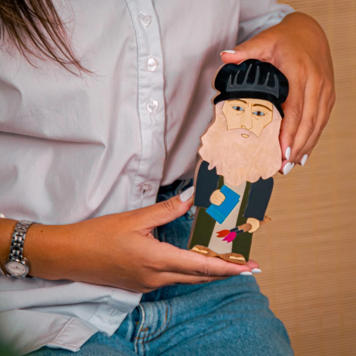 A Boneca Kokeshi Leonardo Da Vinci é uma homenagem à genialidade do mestre renascentista, capturando sua criatividade e espírito inovador em uma peça única. Produzida artesanalmente em madeira de reflorestamento com detalhes em marchetaria de acrílico, apresenta acabamento manual com cera de abelha, garantindo toque suave, aroma natural e durabilidade. Ideal para colecionadores, amantes da arte e da história, ou para quem deseja adicionar um toque de cultura e sofisticação à decoração.