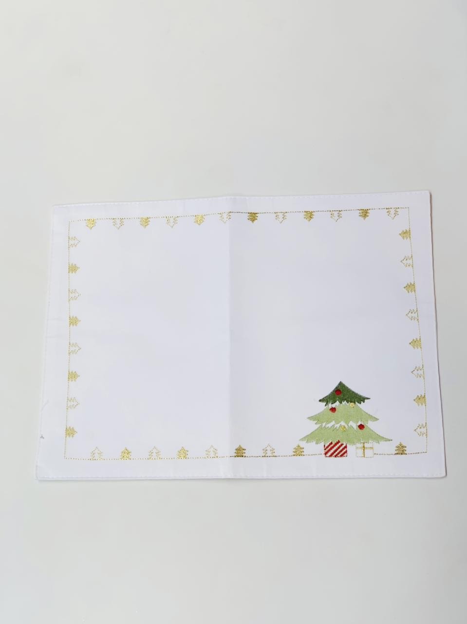 Transforme sua mesa com o Lugar Americano Natalino Árvore, uma peça delicada e festiva que traz o espírito do Natal para suas refeições. Com bordado dourado e ilustração de árvore com presentes, é ideal para compor mesas temáticas com charme e elegância.