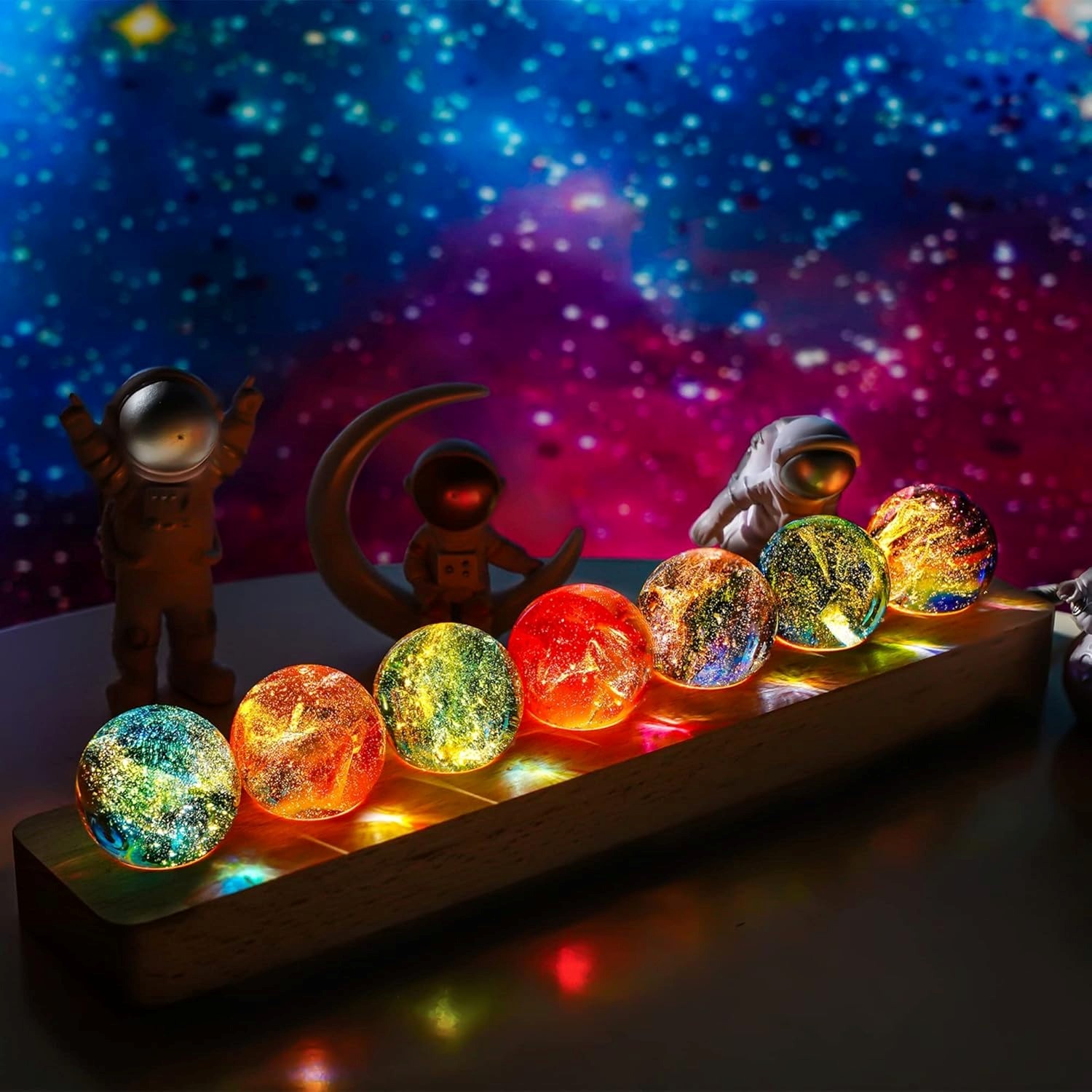Este conjunto une espiritualidade e decoração em uma peça única. A base de madeira iluminada por LED destaca as sete esferas coloridas, cada uma representando um chakra específico. Ao acender, cria um efeito visual semelhante a um céu estrelado, trazendo harmonia e bem-estar ao ambiente.
