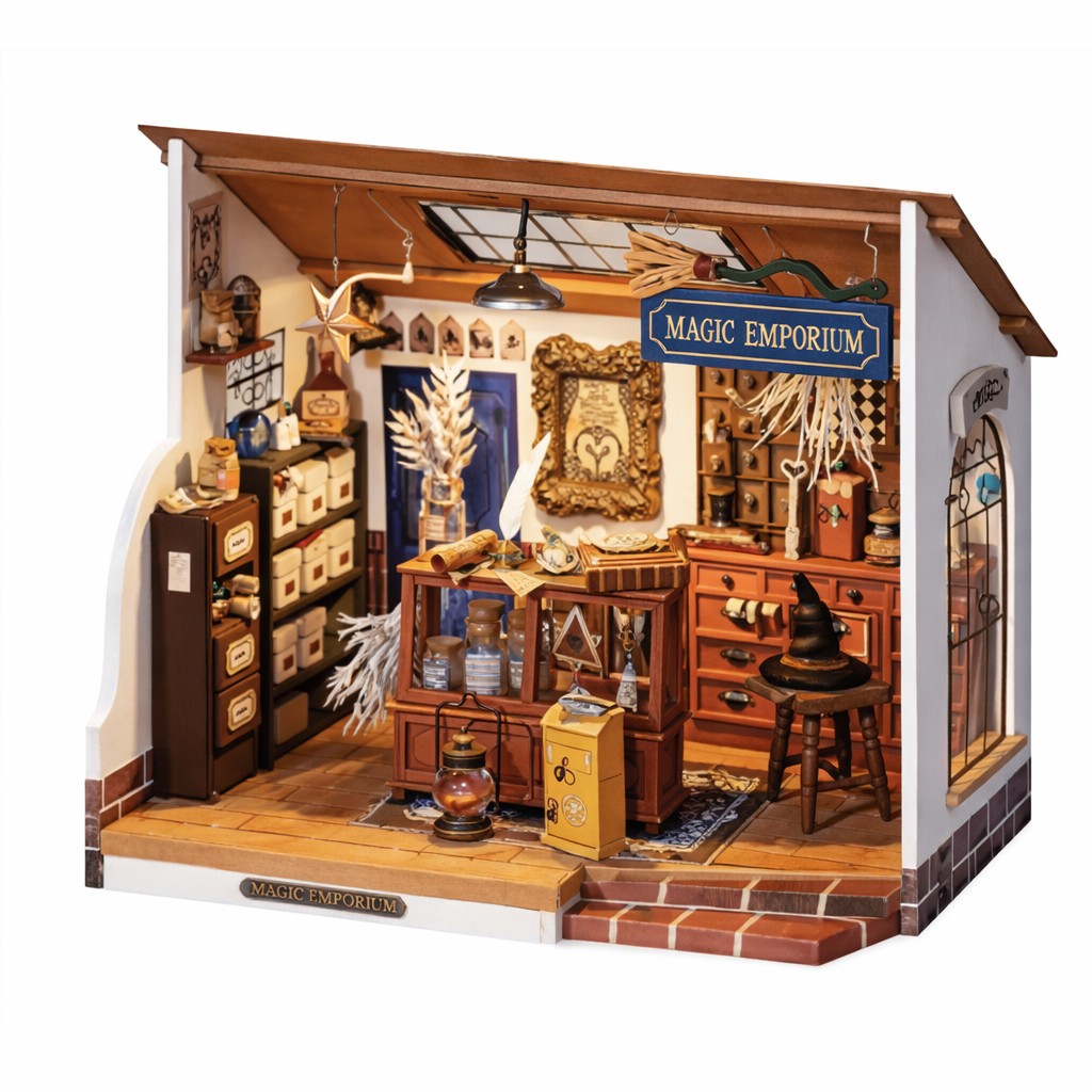Miniatura temática de empório mágico com elementos decorativos inspirados em lojas de feitiçaria. Ideal para estimular criatividade, concentração e habilidades manuais. Produto indicado para montagem detalhada e decoração temática.
